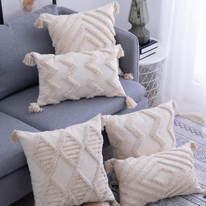 With a touch of tassels, this cushion cover with a lightly textured beige fabric will add a sophisticated look to your home.