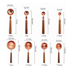 Collection of copper plated measuring cups and spoon, with a walnut handle. Stainless steel allows for easy use and clean - a classy addition to any kitchen.