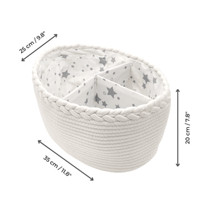 We know that, all too often, when you change your baby’s nappy, it can feel like two hands are not enough. The things you need never seem to be within reach, and babies won’t lie still and wait for anyone! That’s why we’ve designed this cute white nappy basket to keep all nappy changing essentials in one place.