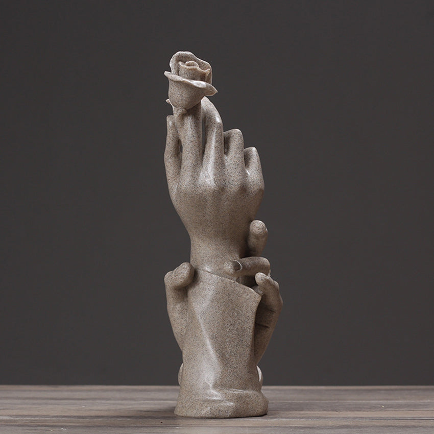• Resin sculpture of embracing hands holding a rose